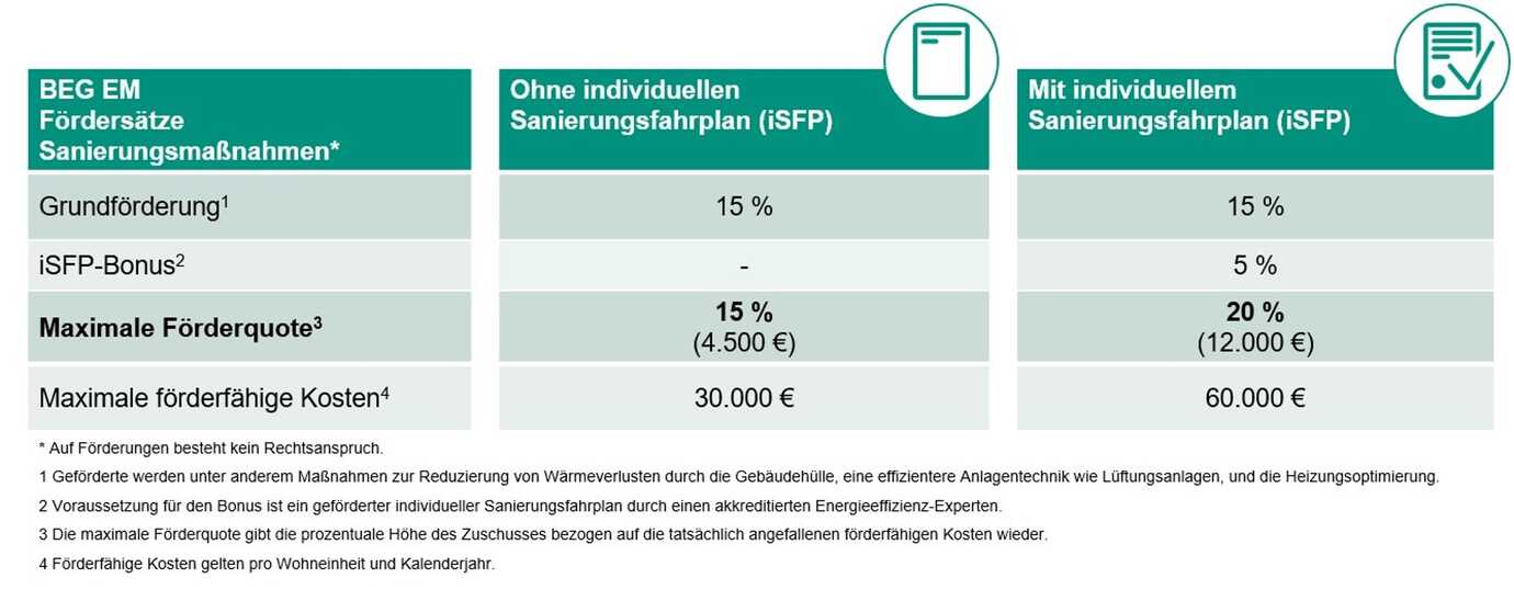 Zusätzlich zur reinen Heizungsförderung können auch diese Maßnahmen bezuschusst werden – insbesondere dann, wenn sie auf einem individuellen Sanierungsfahrplan (iSFP) basieren. Der iSFP wird von einem zertifizierten Energieeffizienz-Experten speziell für Ihr Gebäude erstellt und zeigt Ihnen eine sinnvolle Reihenfolge aller Sanierungsschritte auf.